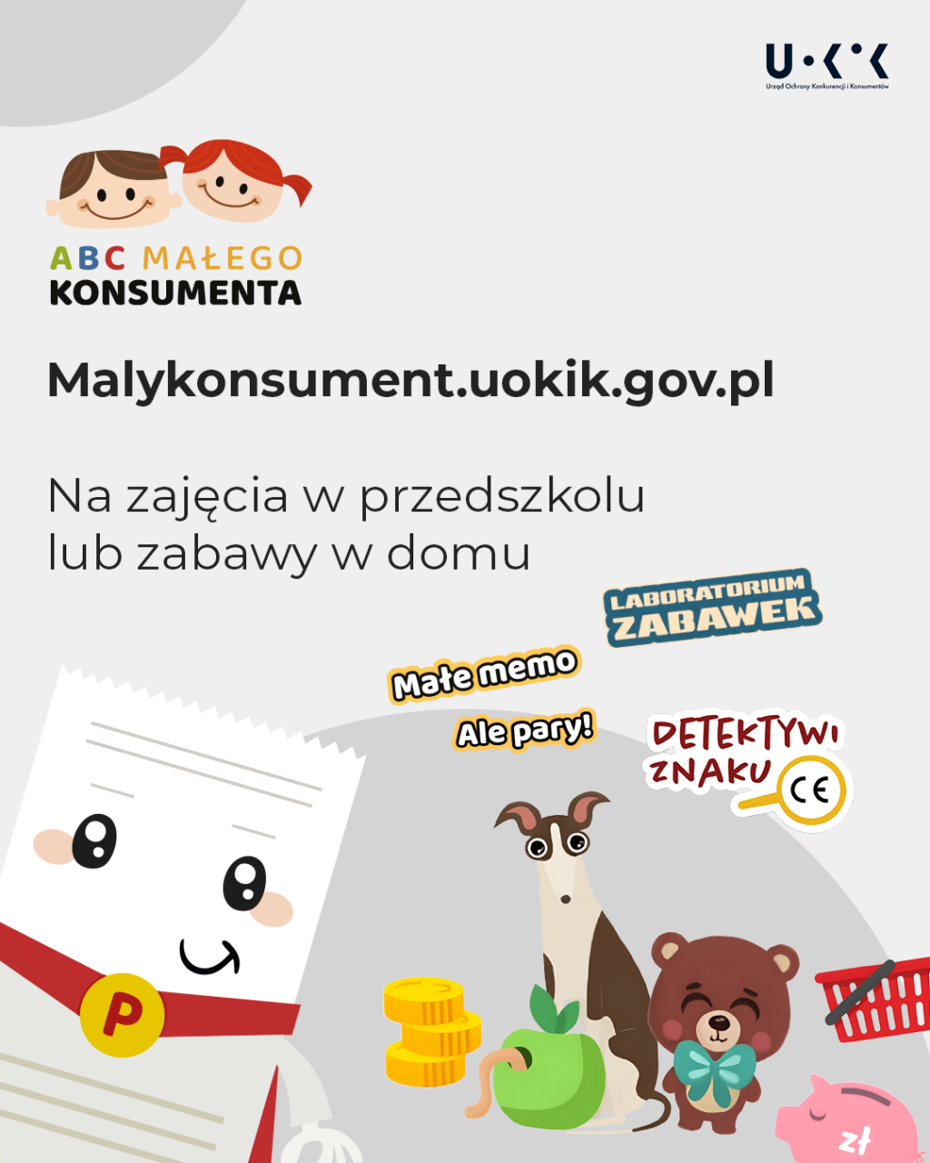 Wiedzę najlepiej przyswaja się w praktyce – a jeszcze lepiej wtedy, gdy nauka jest zabawą i przyjemnością. Dla najmłodszych odbiorców mamy program „ABC Małego Konsumenta”, który łączy nowoczesne technologie z tradycyjnymi formami nauki. Na stronie malykonsument.uokik.gov.pl dostępne są gry online oraz materiały z pomysłami na zajęcia w przedszkolu lub do zabawy w domu.