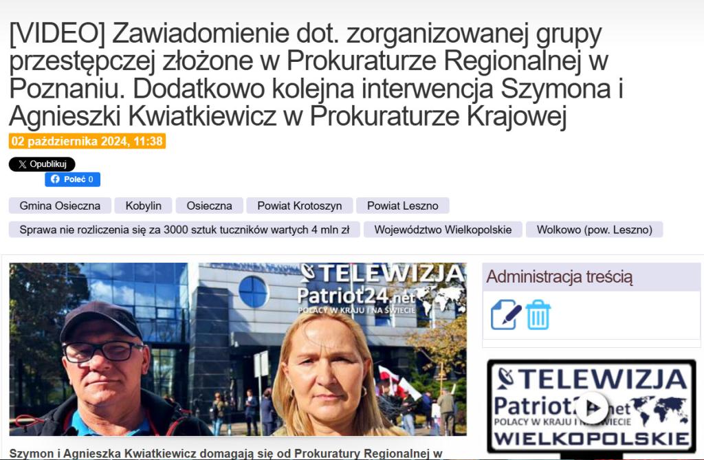 Skuteczna interwencja państwa Kwiatkiewicz i Telewizja.Patriot24.net! Prokurator Rejonowy w Lesznie uznał argumenty i wycofał decyzję o odmowie wszczęcia dochodzenia dot. 2-krotnego okłamania policjantów. Szefowi Agro Fondi sp. z o.o. grozi 8 lat więzienia