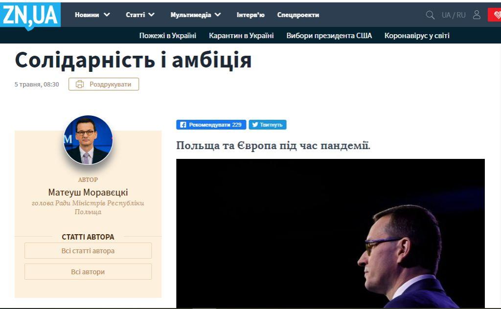 Polska i Europa podczas pandemii. W ukraińskim wydaniu „Dzerkało Tyżnia” ukazał się artykuł autorstwa Premiera Mateusz Morawieckiego. Jest on dostępny pod linkiem: https://dt.ua/international/solidarnist-i-ambiciya-346680_.html