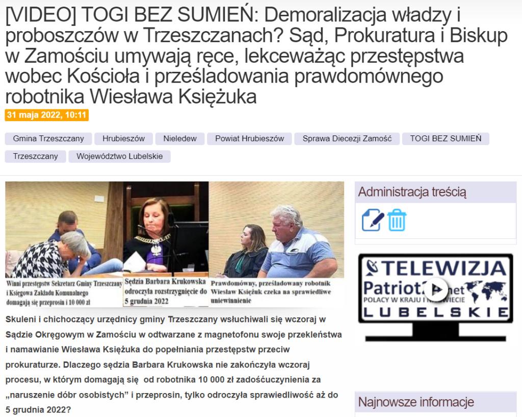 Przypomnijmy, że w tym Sądzie Okręgowym jest też druga przewlekłość sprawy związanej z wójtem gminy Trzeszczanyy Stanisławem Cz. Chodzi o prawdomównego robotnika Wiesława Księżuka, który zasiada na ławie oskarżonych ścigany z oskarżenia prywatnego przez urzędników Uznanych przez Sąd Rejonowy w Hrubieszowie w 2020 r. za winnych przestępstw popełnionych razem z wójtem. Czyli sekretarza gminy Trzeszczany Pawła L. księgową gminnego zakładu komunalnego Michalina L. (domagają się przeprosin i po 10 000 zł zadośćuczynienia!)