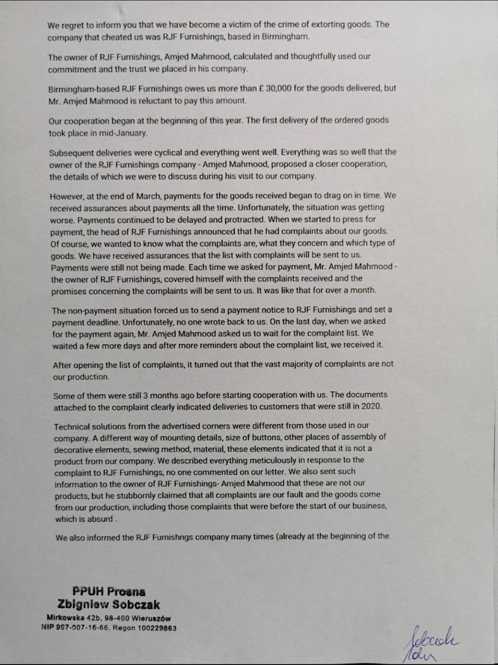 However, at the end of March, payments for the goods received began to drag on in time. We received assurances about payments all the time. Unfortunately, the situation was getting worse. Payments continued to be delayed and protracted. When we started to press for payment, the head of RJF Furnishings announced that he had complaints about our goods. Of course, we wanted to know what the complaints are, what they concern and which type of goods. We have received assurances that the list with complaints will be sent to us. Payments were still not being made. Each time we asked for payment, Mr. Amjed Mahmood - the owner of RJF Furnishings, covered himself with the complaints received and the promises concerning the complaints will be sent to us. It was like that for over a month.