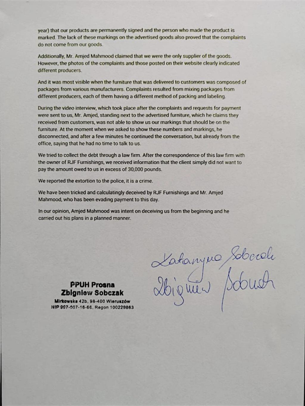Zbigniew Sobczak reported to the Polish police that Amjet Mahmood, as the owner of the RJF FURNISHINGS company from Birmingham, had committed a willful crime of extortion.