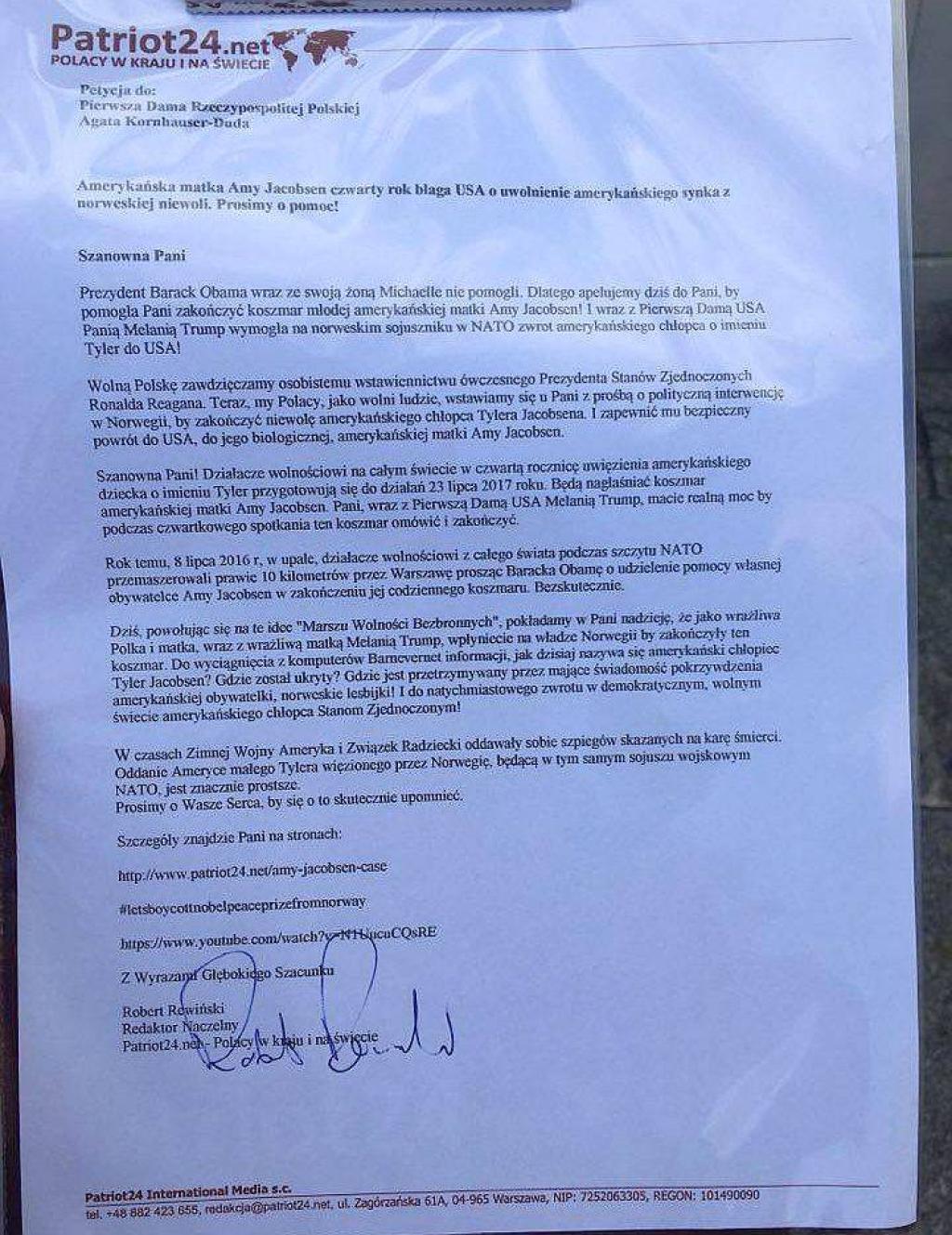 Wolną Polskę zawdzięczamy osobistemu wstawiennictwu ówczesnego Prezydenta Stanów Zjednoczonych Ronalda Reagana. Teraz, my Polacy, jako wolni ludzie, wstawiamy się u Pani z prośbą o polityczną interwencję w Norwegii, by zakończyć niewolę amerykańskiego chłopca Tylera Jacobsena. I zapewnić mu bezpieczny powrót do USA, do jego biologicznej, amerykańskiej matki Amy Jacobsen.