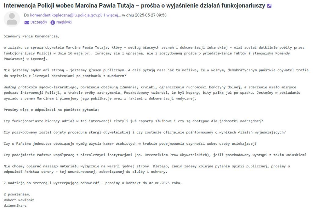 Nie wiadomo również, czy funkcjonariusze byli wyposażeni w kamery osobiste oraz czy zarejestrowano przebieg zdarzenia. Policja nie odpowiedziała też, czy podejmie współpracę z niezależnymi instytucjami, np. Rzecznikiem Praw Obywatelskich, jeśli poszkodowany wystąpi z takim wnioskiem.