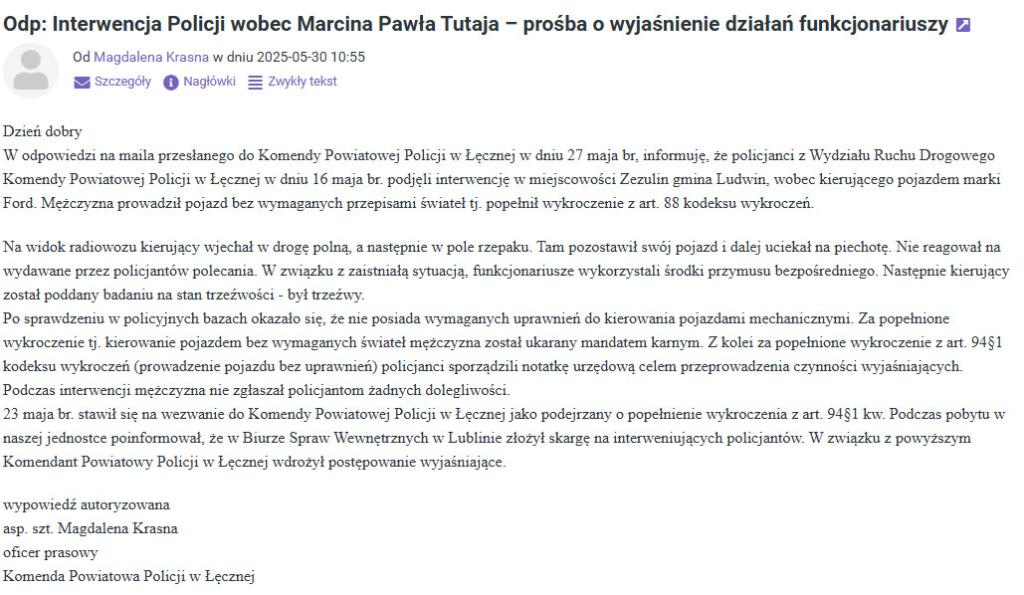 W dniu 23 maja pan Marcin zgłosił skargę na działania funkcjonariuszy do Biura Spraw Wewnętrznych Policji w Lublinie. W odpowiedzi Komenda Powiatowa Policji w Łęcznej poinformowała, że wdrożono wewnętrzne postępowanie wyjaśniające. Brak jest jednak szczegółowych informacji na temat zastosowanych środków przymusu i czy były one proporcjonalne do sytuacji.