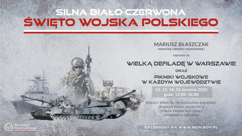 - Silna Biało - Czerwona - to hasło tegorocznych obchodów święta Wojska Polskiego. Rozpoczniemy te obchody już 12 sierpnia. Do 15 sierpnia organizowane będą pikniki. 70 miejscowości w naszym kraju, gdzie będzie można spotkać żołnierzy Wojska Polskiego i porozmawiać z nimi. Takim punktem kulminacyjnym oczywiście będzie 15 sierpnia, Warszawa i defilada. O 14:00 rozpoczynamy defiladę. W defiladzie uczestniczyć będą żołnierze wszystkich rodzajów polskich sił zbrojnych. Będzie także pokaz nowoczesnego sprzętu, więc będą czołgi Abrams, będą czołgi K2, będą bojowe wozy piechoty Borsuk – mówił Mariusz Błaszczak, minister obrony narodowej.